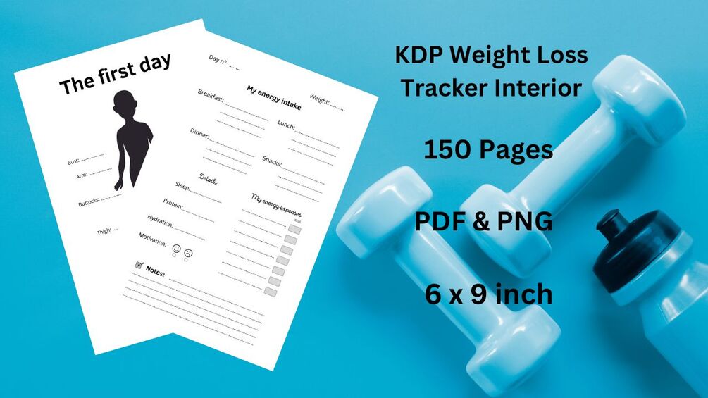 KDP weight loss tracker interior. 150 pages, bleed. 6 x 9 inch. You'll get a PDF file ready to upload and publish, and a PNG file that you can customize.